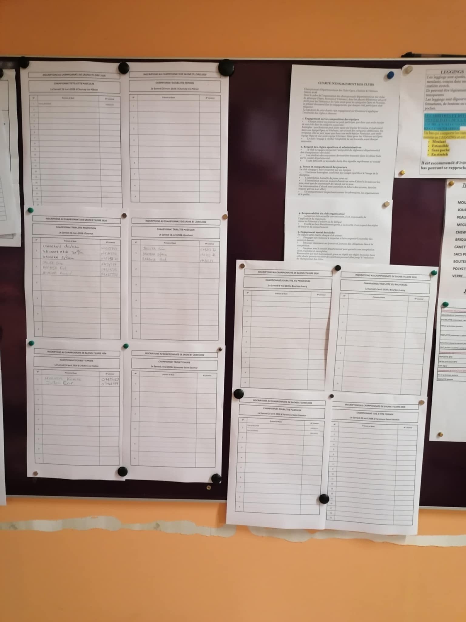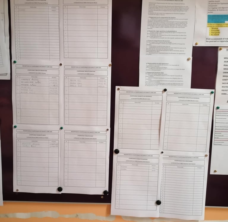 L'inscription à ces championnats est simple et rapide. Il vous suffit de vous rendre directement au boulodrome et de consulter le tableau d'affichage. Les affiches fournissent toutes les informations nécessaires sur les modalités d'inscription. Pensez à vérifier les dates butoirs d'inscriptions pour éviter toute surprise de dernière minute ! Il faut impérativement renseigner vos noms, prénoms et numéros de licences. Pour rappel, le club prend en charge les inscriptions des joueuses et joueurs pour l'ensemble des championnats.